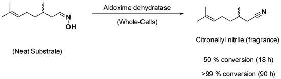 Another important application of aldoxime dehydratases lies in the field of fragrances, as many terpene molecules bearing nitrile groups are utilized in these segments (e.g., nitriles derived from citronellol, geraniol, nerol, etc.), as a recent granted patent of BASF company discloses [23]. Starting from terpene aldehydes, the aldoxime can be straightforwardly formed by reacting with hydroxylamine. The reaction was conducted using whole cells overexpressing aldoxime dehydratases and in solvent-free conditions. That is, only citronellyl-oxime was added (neat) together with the whole cells, leading to full conversion (Scheme 3). Albeit reaction times are somewhat long (90 h for full conversion), and further process optimization may be necessary, working under solvent-free conditions enables the highest product formation possible as well as largely diminished waste generation associated with water or solvent used [9]. Moreover, avoiding solvents may also help circumvent regulations related to some markets and solvent use (e.g., food industry).