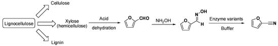 Following the latter path and envisaging sustainable approaches, the area has been developed further by working with biogenic resources to produce nitriles. For instance, the synthesis of 2-furonitrile, starting from furfural, has been considered [29,30]. Furfural can be derived from the acidic dehydration of xylose (pentoses from hemicellulose), and it is a highly relevant platform chemical delivered from biorefineries [4,31]. Furfural can be condensed with hydroxylamine to yield the aldoxime that is subsequently converted by aldoxime dehydratases to 2-furonitrile, which has been used as sweetener as well as a building block for fine chemicals and pharmaceuticals. In this particular case, several aldoxime dehydratases variants were reported for the reaction (Scheme 4).