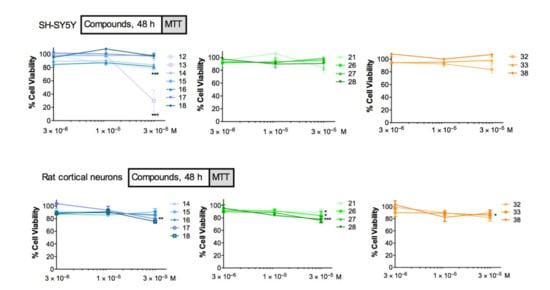 The per se toxicity of the new synthetized compounds was assessed in both cell cultures by the method of MTT reduction. After 24 h of seeding, SH-SY5Y cells were preincubated with compounds at different concentrations (1, 3, 10, and 30 μM) for 24 h. Afterwards, MEM/F12 medium was replaced by one fresh with 1% FBS with the compounds at the same concentration. The viability of cultures was measured 20 h later, following a procedure recently described [44]. In the case of rat cortical neurons, 7 days after seeding, compounds were added to the wells to reach a final concentration of 1, 3, 10, and 30 μM. Forty-eight hours later, neuron viability was measure by the same procedure as the one described for SH-SY5Y cells.