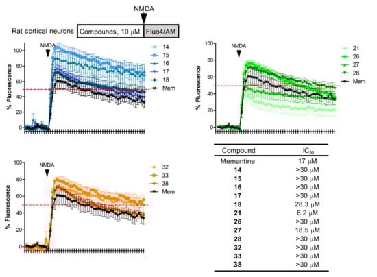 Representative fluorescent curves of [Ca2+]c oscillations for each test compound and the standard memantine (Mem), at the concentration of 10 μM. The curves represent the % of fluorescence compared to a control situation, i.e., cells just stimulated with NMDA 10 μM, and they are the mean ± SEM of at least 3 independent experiments by triplicate. Bottom right, table with the IC50 data calculated from experiments using compounds concentrations from 1 to 30 μM.