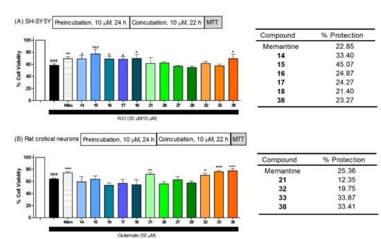 The effect of compounds on the SH-SY5Y cells and rat cortical neurons viability compromised of different toxics was also evaluated by method of MTT reduction [46]. Twenty-four hours after seeding, SH-SY5Y cells were preincubated with compounds at the concentration of 10 μM for 24 h. Afterwards, MEM/F12 medium was replaced by one fresh with 1% FBS, compounds at the same concentration, and rotenone/oligomycin A administered to media at the concentration of 30/10 μM, respectively. The cultures’ viability was measured 20 h later, following the MTT procedure recently described [44]. As reference neuroprotective compound, melatonin 10 nM was selected. In the case of the rat cortical neurons, 7 days after seeding in 48-well plates, neurons were preincubated adding the compounds at a final concentration of 10 μM for 24 h. Then, toxic stimuli of 50 µM of glutamate was added to the wells. After 20 h, cell viability was measured by the MTT procedure [44]. Here, the reference protective compound used was memantine (30 nM).