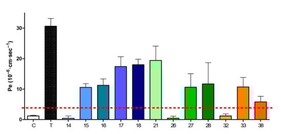 Blood–brain barrier (BBB) permeability evaluated by the parallel artificial membrane permeation assay (PAMPA) method. Permeability is represented as means ± SEM of three independent experiments by triplicate. C (caffeine) and T (testosterone) are negative and positive control, respectively. A value of Pe ≥ 4 indicates ability to cross the BBB passively.