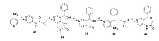 Finally, we appreciated that 4-aminopyridine could become an eligible starting point for the synthesis of new pyridothiazepines with enhanced polarity, different to the previously described pyrido [2,3-e][1,4] thiazepines [36], as they would give rise to interesting pyrido[4,3-e][1,4] thiazepine bicycles. Protection of 4-aminopyridine with pivaloyl chloride was conducted in good yield at lower temperature (−20 °C), to avoid the formation of diacylated product, observed at rt. Regular ortho-lithiation conditions and the subsequent addition to benzaldehyde, conducted this time at −20 °C unlike previous reactions, provided the corresponding intermediate 35 in excellent yield (90%). Then, the one-pot reaction using methyl thioglycolate in TFA at high temperature (up to 115 °C, including the use of sealed tube) failed. Alternatively, we recruited the three steps plan. Hence, pivaloyl group was removed under basic aqueous conditions (KOH in ethanol/H2O reflux) and the free amino alcohol 36 suffered nucleophilic substitution of methyl thioglycolate aided by TFA under CH2Cl2 reflux, obtaining 36 in low yield, presumably due to the scarce contribution of the pyridine ring to the stability of the intermediate carbocation. Lastly, cyclization to form the desired pyrido[4,3-e][1,4] thiazepine 38 was accomplished by deprotonation of the amine with LiHMDS in THF (Scheme 5). The global yield of these three chemical steps reached a decent 22% (13% from aniline, five reaction steps). Intriguingly, the incorporation of an aromatic nitrogen at position 7 gave rise to a pyridothiazepine derivative with a very good clog p value (1.93, Table S1, Supplementary Material), much better than those of the previously reported pyrido[2,3-e][1,4] thiazepines [36].