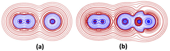 Any Ng-X is assigned as covalent (Cov) if (i) it is of type A, and (ii) the electron density at the BCP, ρ(BCP) is at least 0.08 ea0−3. This is the case of the N2 moiety of the N2-Ar and N2-ArBeO shown in Figure 1a,b. Any Ng-X not fulfilling these criteria wasfurther assayed by integrating the H(r) over Ωs. If the function was, invariably, positive over the entire volume, the interaction wasassigned as non-covalent (nCov). If the function waspartially or fully negative, the Ng-X wasassigned as partially-covalent (pCov), and distinguished as H+/−, H−/+, and H−, the superscript indicating that, over Ωs, the H(r) was ranging from negative to positive, but, on the average, was positive (H+/−) or negative (H−/+) or, that it is invariably negative (H−). Interactions of type C involving a single Ng atom, such as the N2-Ar shown in Figure 1a, and all the other presently investigated LAr (vide infra) were also assayed in terms of the degree of polarization of Ng, DoP(Ng). This index measures, in essence, the deformation of the H−(r) region of Ng arising from the interaction with X [23,32]. The DoPis, in particular, defined by the equation: