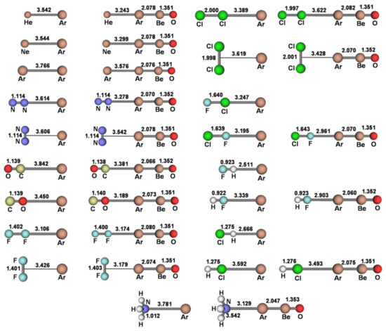 The investigated LAr includedthe diatomic HeAr, NeAr, and ArAr, the linear and T-shaped (N2)Ar, (F2)Ar, and (Cl2)Ar, the linear isomeric (CO)Ar, (FCl)Ar, (HF)Ar, and (HCl)Ar, and the H3N-Ar structure of C3v symmetry. These species were explored at both the MP2/aVTZ and CCSD(T)/aVTZ level of theory, andinvariably characterized as true minima on the potential energy surface (PES). The only exceptions were the OC-Ar and the H3N-Ar, both featuring a doublydegenerate imaginary absorption (number of imaginary frequencies NIMAG = 2). As shown in Table S1 of the Supplementary Materials, the MP2/aVTZ and CCSD(T)/aVTZ harmonic frequencies of the LAr were, invariably, quite similar, and the MP2/aVTZAr-X distances featured a mean unsigned deviation (MUD) from the CCSD(T)/aVTZ values of only 0.0385 Å.We also ascertained (see Table S1 of Supplementary Materials) the high similarity between the MP2/aVTZ and CCSD(T)/aVTZ predicted data of the simplest He-ArBeO, Ne-ArBeO, Ar-ArBeO, and HF-ArBeO. Based on these findings, all the other L-ArBeO (L = N2, CO, F2, Cl2, ClF, HCl, NH3) were investigated at the predictably accurate MP2/aVTZ. The connectivities and bond distances of all the presently investigated LAr and L-ArBeO are thus shown in Figure 2 (their Cartesian coordinates are also availableas Data S1 of the Supplementary Materials).Their CCSD/aVTZT1 diagnostics (the norm of the vector t1 of the single-excitation amplitudes from the CCSD calculation divided by the square root of the number of correlated electrons N, ) resulted invariably within the accepted threshold of 0.02 [44], thus confirming the validity of a mono-determinantal description of their wave functions.