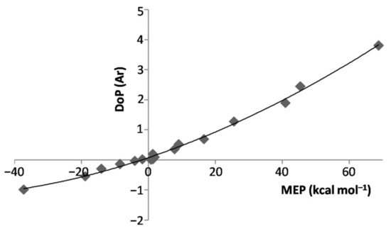 We first note from Figure 2 the strict relationship between the connectivity of any LAr and the position of the VS,max or VS,min of the involved ligand. In essence, the anisotropy of the electron density of L directed the Ar atom toward the stationary point(s) on the PES. Depending on L, however, the potential locally-experienced by Ar was quite different, and ranged (see Table 3) from the definitelynegative one at the VS,min(N) of NH3 (−37.25 kcal mol−1) to the definitely positive one at the VS,max(H) of HF (68.78 kcal mol−1), passing through the only slightly-positive values of He (1.26 kcal mol−1), Ne (1.02 kcal mol−1), Ar (1.85 kcal mol−1), and at the VS,max(perp) of F2 (0.76 kcal mol−1) and Cl2 (1.26 kcal mol−1). Interestingly, as expected from the results of our recent studies on other numerous Ng complexes [23,32], these different local fields produced a well-recognizable effect, namely the polarization of Ar in modes and extents that strictly mirror the values of the MEP. This phenomenon is effectively caught by the DoP(Ar) (vide supra) of the various LAr (see Table 1) that is positively correlated with the MEP at the VS,max or VS,min of L (see Table 3). This is graphically shown in Figure 3.