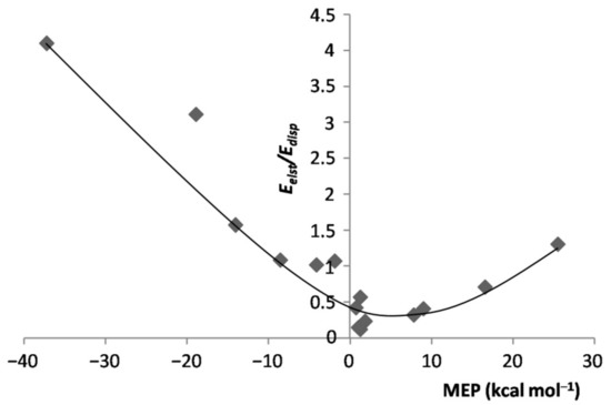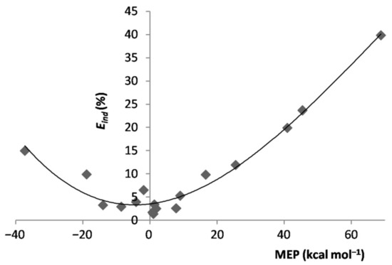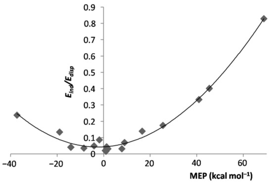 In essence, when exposed to the MEP of the ligand, the Ar atom polarized toward/opposite to it, the effect increasing by increasing the magnitude of the experienced positive/negative MEP. However, the polarization of Ar was, expectedly, the major physical phenomenon behindthe inductive component of the interaction. As a matter of fact, as shown in Figure S1 of the Supplementary Materials, for both positive and negative values of the MEP of L, the of the various LAr generally increased by increasing the magnitude of the MEP. This positive correlation becomes even more clear by inspecting Figure 4, showing the dependence on the MEP of Lof the percentage contribution of to the total attractive part of the SAPT interaction, . On the other hand, neither the absolute nor the percentage contribution of the LAr correlated with the MEP of L. This was, indeed, not unexpected, as this termsolely arises from non-specific electrostatic interactions between the frozen densities of L and of the apolar Ar. One also notes from Table 1 thatthe of the various LAr spanned in the small range between ca. 12 and ca. 22%. These nearly constant contributions produced an inverse dependence between and (Figure S2 of Supplementary Materials), a positive correlation between and the MEP of L (Figure S3 of Supplementary Materials), and the positive correlation shown in Figure 5 between the ratio of the LAr, and the MEP of L. The absolute values of are, in any case, totally uncorrelated with the MEP. The dispersion is, in fact, also a form of polarization [67], but different in originfrom the inductive effects exerted by the MEP.