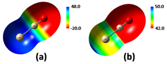 The only slightly positive electrostatic potential of Ar (1.85 kcal mol−1 at the MP2/aVTZ0.0010 ea0−3 isodensity surface) was dramatically affected by the ligation with BeO. As shown in Figure 6a, plotting the MEP of ArBeO in the scale between −20 and 48 kcal mol−1, the Ar atom appeared as definitely positive, with a seemingly uniform MEP at around 48 kcal mol−1. However, as shown in Figure 6b, using a narrower scale between 42.0 and 50.0 kcal mol−1, the MEP of Ar emerged as clearly anisotropic, and featured a VS,max of 50.9 kcal mol−1 on the outer prolongation of the Ar-Be axis. This maximum signs a σ-hole arising from the polarization of Ar by BeO toward the inner region of the Ar-Be bond.