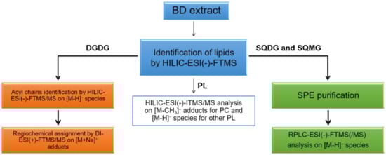 Adopted workflow: lipids from algal samples were extracted by using the procedure described by Bligh and Dyer. HILIC-ESI-(-)-FTMS(/MS) and HILIC-ESI-(-)-ITMS/MS were employed, in synergy, to characterize PL and DGDG; the regiochemistry of DGDG was assessed using direct infusion (DI)-ESI(+)-FTMS/MS analyses on the corresponding sodium adducts. RPLC-ESI(-)-FTMS/MS, following SPE-based purification, was adopted for the characterization of sulfur-containing glycolipids SQDG and SQMG.
