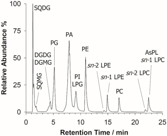 As expected, a separation based on the lipid class was typically observed [28]. The identification of lipids was accomplished using accurate m/z values, retrieved upon averaging the mass spectrum of each chromatographic peak/band, as input values for searches based on the Online Lipid Calculator (OLC, www.mslipidomics.info/lipid-calc/ accessed on 21 April 2021) or the Lipid Maps (www.lipidmaps.org/ accessed on 21 April 2021) databases, setting a mass accuracy ≤5 ppm. An output reporting the possible lipid class, along with the total number of carbon atoms and unsaturations (expressed with the C:U notation) of the fatty acyl chains included in each compound, was obtained. A lipid class confirmation was subsequently achieved for each lipid by the generation of specific class-related product ions in the corresponding tandem mass spectrum. The following lipid classes, eluting according to their relative chemical polarity, as expected for a HILIC column, were recognized: SQDG, sulfoquinovosyl monoacylglycerols (SQMG), DGDG, along with digalactosyl monoacylglycerols (DGMG), PA, phosphatidylglycerols (PG), PI, co-eluting with lyso-PG (LPG), PE, lyso-PE (LPE), PC, and lyso-PC (LPC). The most abundant PL and GL are summarized in Table 1. It is also worth noting that diacylarsenosugar phospholipids (As-PL), present at low concentrations and co-eluting with LPC, were also detected; their characterization has been recently described elsewhere [18].