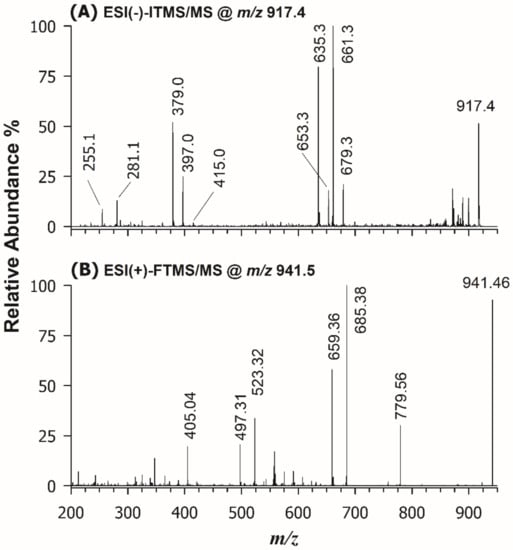 (A) ESI(-)-ITMS/MS spectrum, obtained after HILIC separation of the BD extract of U. pinnatifida, of the [M-H]─ ion detected at m/z 917.4; (B) ESI(+)-FTMS/MS spectrum, obtained upon direct infusion of the same BD extract after sodium acetate addition, for the [M+Na]+ ion detected at m/z 941.46. The final assignment inferred from the two spectra was DGDG 16:0/18:1.