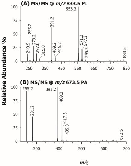 ESI(-)-ITMS/MS spectra of the precursor ions at m/z 833.5 (A) and 673.5 (B), assigned to PI 16:0/18:2 and PA 16:0/18:1, respectively.