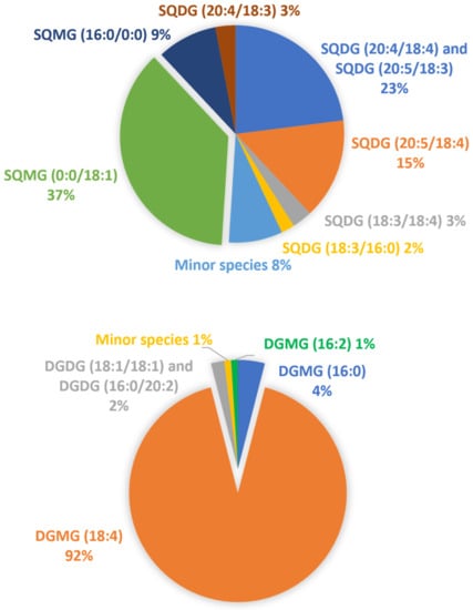 Unlike SQDG, the most abundant PL identified in the lipid extract of U. pinnatifida exhibited the longest and most unsaturated acyl chains in the sn-2 position. A semi-quantitative comparison of each phospho-, sulfo-, and glycolipid was performed by calculating the relative abundances in the examined extracted sample. A class-related area was computed as the sum of the areas of each detected lipid species from the corresponding extracted ion current (XIC) chromatogram. The relative abundance (r.a.) of each lipid was thus evaluated by its peak area over the area sum of all identified class-related species. Apparently, the most abundant class among them is represented by PI (28%), followed by PG (16%) and corresponding LPG (15%). The fatty acyl chain with 16 carbon atoms (likely corresponding to a palmitoyl chain) was the most abundant saturated one, while among the main monounsaturated and polyunsaturated acyl chains, C18:1, C18:2, and C20:4 were found, in good agreement with previous works on the red algae Rhodymenia pseudopalmata [26] and Gracilaria vermiculophylla [50]. The occurrence of fatty acyl chains C16:0 and C18:1 in blue-green algae was also demonstrated by Parker et al. [51]. It is worth highlighting that the U. pinnafitida lipidome also exhibited the occurrence of odd-numbered acyl chains, namely, C15:0, C17:0, C19:0, and C19:1 (see Tables S1–S8 in Supplementary Information). Although this outcome was in agreement with earlier investigations on marine algae [16,21,22], the existence of microbial contaminations in the analyzed samples cannot be ruled out as an additional source of lipids with odd-numbered side chains. High amounts of myristic and palmitoleic acyl chains were also detected, in agreement with Shanmugam and Palpandi, who investigated the lipid profile of the green alga Ulva reticulata [52]. An apparent peculiar result was observed comparing our data with those reported by Takagi et al. [53], who studied the lipidome of plenty of algal specimens, as they reported the presence of minute amounts (r.a. 0.13%) of hexadeca-4Z,7Z,10Z,13Z tetraenoic acid (C16:4 ω3) in the sea mustard. Albeit its occurrence in the wakame algal matrix was also confirmed by Ishihara et al. [54] and Schlotterbeck et al. [22], no presence of the 16:4 chain was found in our samples. This relatively short and highly unsaturated acyl chain might occur in neutral lipids (e.g., glycerolipids), or can exist as one of the free fatty acids, both not investigated in this work. For glycolipids, semi-quantitative data can be obtained since the ratio is calculated within the same lipid class being the ionization yield less affected by their acyl chain properties. As already mentioned, the r.a. of each lipid species within a specific class, was estimated from the corresponding XIC chromatogram, then the sum of all peak areas for compounds detected in the class was calculated. In Figure 6 are depicted the r.a. of SQDG (upper panel) and DGDG (lower panel) classes and the relevant lyso-forms (SQMG/DGMG) in the wakame seaweed lipid extracts. Concerning the fatty acyl chains of SQDG in brown algae, our findings are in good agreement with those of Khotimchenko [55] because FA 16:0, 18:1, 18:2, and 18:3 were found to be predominant within this sulfolipid class. The abundance of fatty acyl chains C16:0 and C18:1 was already demonstrated in the DGDG profile of brown algae [56,57]. It is worth mentioning the prevailing detection of DGMG 18:4 that agreed with previous findings [22] and provided compelling evidence of this fatty acyl chain in the wakame seaweed.