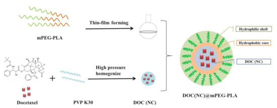 Considering the statements above, we aimed to construct a novel nanocrystal-loaded micelles delivery system to improve the in vivo circulation of docetaxel, docetaxel nanocrystals, and docetaxel micelles. Herein, we prepared docetaxel nanocrystals (DOC(Nc) by using high-pressure homogenization, and then embedded DOC(Nc) into the inner core of the micelles by using mPEG-PLA as their structural material. Figure 1 illustrates the preparation scheme of docetaxel nanocrystal-loaded micelles (DOC(Nc)@mPEG-PLA).