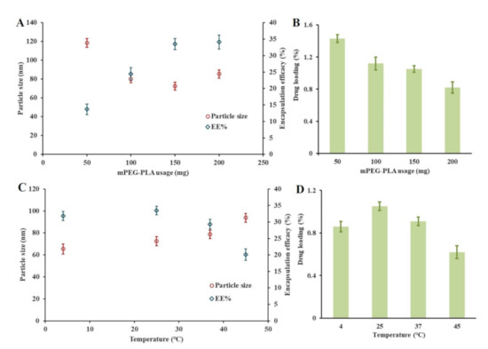 Several mPEG-PLA were dispersed in 10 mL 95% ethanol, and then the thin film was formed by removing the ethanol under 50 °C. 10 mL DOC(Nc), prepared as Section 3.2., was added to the thin film, and underwent sonication for 3 min, holding for 30 min at pre-set temperatures. The unencapsulated DOC(Nc) was removed by centrifugation at 12,000 rpm for 10 min, followed by filtration through 0.22 µm microporous membrane. The effects of mPEG-PLA usage and hydration temperatures on the particle sizes, DL, and EE of DOC(Nc)@mPEG-PLA were studied.