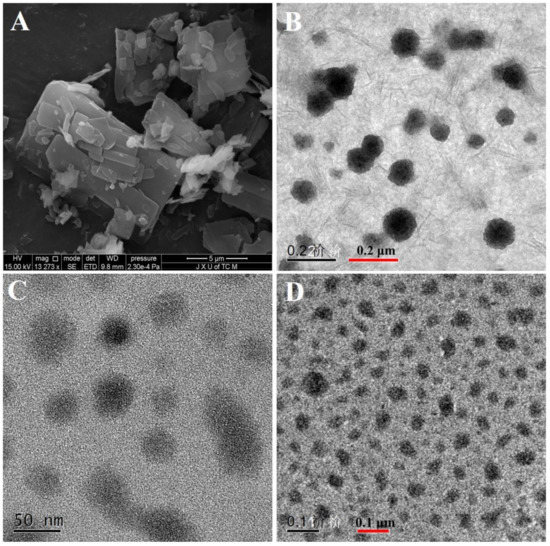 The SEM photo of DOC (A); the TEM photos of DOC(Nc) (B), DOC@mPEG-PLA (C), and DOC(Nc)@mPEG-PLA (D).