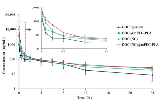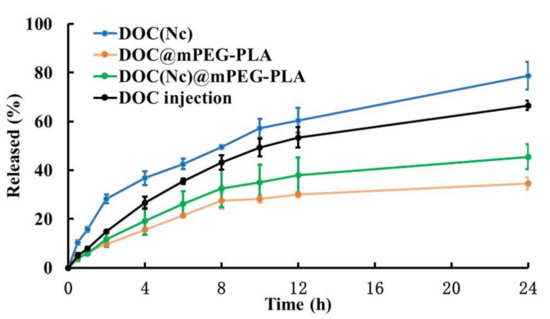 As in vitro release profile typically has good correlation to in vivo performance, we operated a release study to better understand the in vivo pharmacokinetic behaviors of different formulations. The in vitro release behaviors of DOC, DOC(Nc), DOC@mPEG-PLA, and DOC(Nc)@mPEG-PLA were studied by dialysis performed in a PBS buffer (pH 7.4), which could be used to simulate the conditions in blood circulation. Owing to its decreased particle sizes and diffusion layer, DOC(Nc) released faster than DOC [35], and the release rate of DOC slowed down after transferring it into micelles, which may be attributed to factors such as hydrophobicity of the inner core of micelles and hydrogen bonding between molecules [36,37,38]. The release rate of DOC(Nc)@mPEG-PLA was faster than DOC@mPEG-PLA, and slower than DOC (Figure 6).