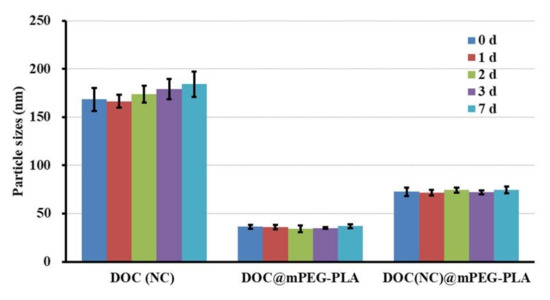After placing the DOC(Nc), DOC@mPEG-PLA, and DOC(Nc)@mPEG-PLA at room temperature for 7 days, the particle sizes of each sample at 0, 1, 2, 3, and 7 days were detected. Figure 7 illustrates that there was no significant change to particle sizes during the experimental period, revealing that these three formulations had good stability at room temperature without any dilution. In addition, after incubating with a PBS buffer or PBS buffer containing 10% FBS (10% FBS-PBS buffer) for 8 h, the particle sizes of DOC(Nc), DOC@mPEG-PLA, and DOC(Nc)@mPEG-PLA were changed from 173.5 ± 8.3, 33.8 ± 1.9, and 77.9 ± 3.3 to 176.4 ± 5.3, 30.7 ± 2.8, and 75.2 ± 4.9, respectively, in PBS buffer, while in 10% (v/v) FBS-PBS buffer, the particle sizes were changed from 191.4 ± 15.3, 42.8 ± 1.7, and 83.5 ± 5.0 to 382.5 ± 21.4, 57.2 ± 3.8, and 101.3 ± 6.7 for DOC(Nc), DOC@mPEG-PLA, and DOC(Nc)@mPEG-PLA, respectively. These results show that these nano formulations were stable in a PBS buffer; however, after incubating with serum, the particle sizes of nanocrystals largely increased, which may be due to the drug-protein interaction [39], and, due to the excellent hydrophilic property of mPEG, the micelles and nanocrystal-loaded micelles exhibited good stability [40].
