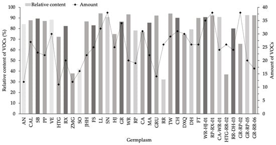 Table 1 showed the information about 34 germplasms. A total of 164 VOCs whose relative content were higher than 0.05% were found in these germplasms (Table S1, Supplementary Material). The number of VOCs ranged from 11 only in HTG to 38 in three germplasms, including SN, RP-RX-01 and GR-RP-02 (Figure 1). Out of the 34 samples detected, the numbers of VOCs in 27 samples were found to exceed 20, of which 10 samples were above 30; other 7 samples contained less than 20 VOCs, of which HTG, ZMG, AN were as low as 11, 11 and 12. The percentages of VOCs’ relative contents accounted for 32.39% in RR to 94.28% in LL. A majority of germplasms contained high VOC contents, in which 23 samples were detected to have greater than 80%. The relative contents of all detected VOCs were present between 60% and 80% in 7 individual germplasms. Four samples, including SO, ZMG, RR and HTG-RR-02, contained VOCs with low percentages of less than 50%.
