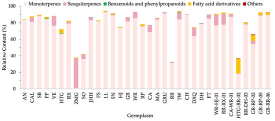 Numbers and relative contents of VOCs differed in tested freesia germplasms, and relative contents did not correspond to numbers. It was revealed that high VOC numbers did not mean high content for all germplasms. Typically, the germplasms with many VOCs were accompanied by high relative contents. However, the samples with large numbers of VOCs may contain low percentages (≤50%), such as RR and HTG-RR-02. Conversely, some germplasms emitted few VOCs and contained high VOCs percentages, including AN, HTG, GRU and GR-RR-06.