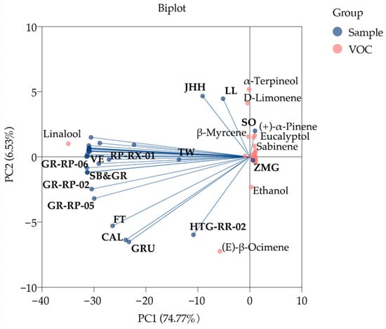 PCA was performed to explore the preliminary classification of different samples and the important compounds correlated with them. The comparatively dispersive samples and evidently contributing VOCs were marked in the biplot (Figure 3). PC1 and PC2 explained 74.77% and 6.53% variances of compounds, respectively. The distribution of samples assumed two different trends. Most samples which linalool had a strong positive influence on were gathered; conversely the others dispersing far away from linalool were slightly affected. Of these linalool-affected samples, VE, GR-RP-06, SB, GR, GR-RP-02, GR-RP-05, SNFT, CAL, GRU and HTG-RR-02 were positively correlated with (E)-β-ocimene. SO (PC1, 0.988) and ZMG (PC1, 0.025), the samples that most positively correlated with PC1, were almost irrelevant to linalool, of which SO were highly affected by β-myrcene, eucalyptol, (+)-α-piene and sabinene. α-terpineol and d-limonene significantly impacted JHH and LL, but negatively impacted FT, CAL, GRU and HTG-RR-02. Ethanol had a positive influence on HTG-RR-02.