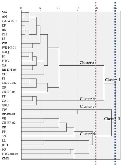 As a result of HCA, the dendrogram showed that 34 samples were clustered distinctly into two groups by the proportion difference of VOCs when Euclidean distance was 25 (Figure 4). Cluster I contained 22 samples, in which there were noticeable preponderant compounds accounting for more than 55%, and the other components were observed in only a few percentages from 0.5% to 3%. The discussion of Cluster I was mainly about the predominant VOCs. When the distance was 20, Cluster I was divided into 2 subgroups based on the variation of dominant compounds. The 19 samples in Cluster a were representative of the only high percentage compound, linalool, and Cluster b, including 3 samples (FT, CAL, GRU), was prominently by linalool and (E)-β-ocimene. Cluster II contained 12 samples, with the composition pattern showing that the substances’ percentages were gradually decreasing from the chief substance less than 55% to low relative content VOCs. When the geometrical distance was 20, Cluster II was also classified into two subgroups according to composition differences. TW and RP-RX-01 were separated into group c due to their similar constituents and proportions of linalool, (Z)-β-ocimene, copaene, (E)-β-ocimene, cyperene, ethanol and rosefuran. In group d, the first high percentages were less than 45%, the second was less than 20%, the third was under 12% and the other constituents had a slight step-down in percentages. Within the 10 samples of group d, VE, GR-RP-2, RR, PP and SN were clustered together due to linalool being the highest percentage substance; SN was the only sample that contained nerol in high relative content. LL was closely identified with JHH for their semblable compositions, which contained, sequentially, α-terpineol, d-limonene, eucalyptol, β-myrcene, sabinene, linalool and so on. The last branch in group d contained SO, HTG-RR-02 and ZMG in low total relative contents, as well as various major compounds including (+)-α-pinene, ethanol and α-selinene, respectively.
