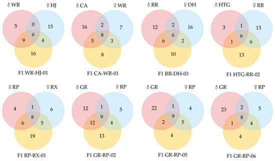 Venn diagrams of numbers of VOCs of 8 freesia hybrids with their parental species.