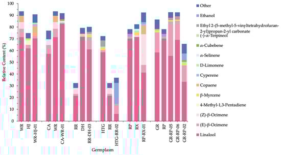 Figure 6 showed the relative contents of total VOCs and some important compounds of parents and hybrids. It was observed that different parental species groups generated various results, and the relative contents in most hybrids were near to, or higher than, parental species. Firstly, in WR-HJ-01, CA-WR-01 and RR-DH-03, the VOC proportions of hybrids were closer to the parents, with the advantage of high VOCs relative content, mainly due to an increase in copaene, linalool and (E)-β-ocimene, respectively. Secondly, the percentage of HTG-RR-02 was observed in evident proximity to RR, the female parent with low VOC relative content, as a result of a decrease in linalool percentage and a substantial increase in ethanol percentage. Thirdly, heterosis was present in RP-RX-01, GR-RP-05 and GR-RP-06. This occurred in RP-RX-01 mainly because of the increase of ocimene. However, as the offspring of the same parents (GR and RP), GR-RP-02 contained the lowest VOCs, even less than parents, which was also observed via linalool relative content decrease and ethanol content increase.