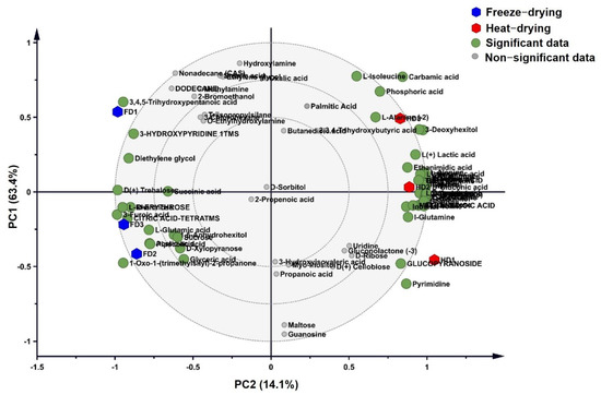 A principal component analysis of the primary data detected by GC-TOF-MS was performed in the SIMCA program. For the metabolite analysis, three biological replicates per treatment sample were analyzed, and the results were presented in principal component 1 (PC1, 63.4%) and PC2 (14.1%). The differences in the primary metabolite data between freeze-drying (blue hexagon) and heat-drying (red hexagon) in the Student’s t-test are marked as green circles (p < 0.05), and the nonsignificant data are indicated by gray circles (p > 0.05).