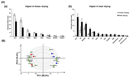 Protein analysis based on SDS-PAGE-LC-MS. (A) Proteins were significantly (p < 0.05) changed between freeze-drying (Aa) and heat-drying (Ab) in the Student’s t-test and classified based on the drying methods in the PCA biplot (*: p < 0.05 and #: p < 0.005). (B) Blue hexagons represent the freeze-dried samples, red hexagons represent the head-dried samples, and the significant protein molecules are expressed by green circles. The results are expressed as the mean ± standard deviation, and the t-test was performed to confirm the significant differences. PC: principal component; ND: not detected; CAT: catalase; ATPase: ATP synthase; PGK1: phosphoglycerate kinase1; MDH: malate dehydrogenase; SOD: superoxide dismutase; PPlase: peptidyl-prolyl cis-trans isomerase; IMPDH: Inosine-5′-monophosphate dehydrogenase; SDADH: succinate semialdehyde dehydrogenase; ACS: ATP-citrate synthase; PK: pyruvate kinase; GAPDH: glyceraldehyde-3-phosphate dehydrogenase; PC: pyruvate carboxylase; GS: glutamine synthetase; CBS: cystathionine beta-synthase; CS: chorismite synthase; PEC: proteasome endopeptidase complex; PHGDH: D-3-phosphoglycerate dehydrogenase; FBA: fructose-bisphosphate aldolase; spe-Sdh: Spermidine synthase-saccharopine dehydrogenase; IPPisomerase: Isopentenyl diphosphate isomerase.