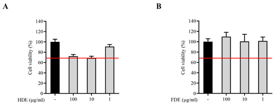 The effects of the heat-dried extract (HDE) (A) and freeze-dried extract (FDE) (B) on the cell viability in microglial BV2 cells were assessed by the MTT assay. The BV2 cells were treated with various concentration (1, 10, and 100 µg/mL) of GL extracts, and the cell viability was measured. The red line indicates a 70% acceptable range of cell viability.