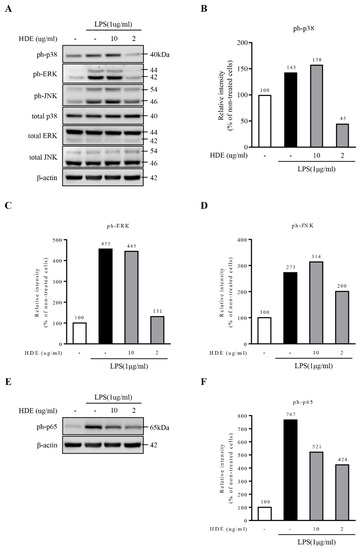 Inhibitory effect of HDE on the MAPKs in LPS-stimulated BV2 cells. (A–D) Western blot analysis on the p38, ERK1/2, and JNK phosphorylation levels in the BV2 cells. The cells were pretreated with HDE 2–10 µg/mL for 2 h prior to LPS (1 µg/mL) exposure for 24 h. (E,F) Western blot analysis on ph-p65 and protein expression in the BV2 cells when pretreated with HDE prior to LPS exposure. β-actin was used as the housekeeping protein.