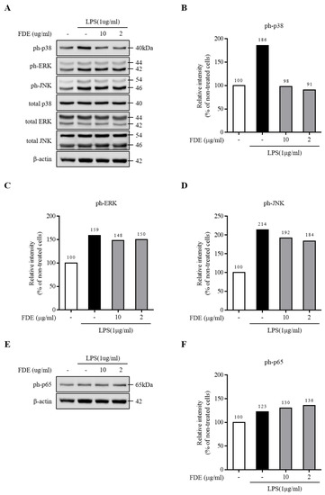 (A–D) Effect of the freeze-dried extract (FDE) on the phosphorylation levels of ph-p65, ph-p38, and ph-JNK in LPS-treated BV2 cells pretreated with FDE 2–10 µg/mL for 2 h, followed by 24 h of exposure to LPS (1 µg/mL). The cells were lysed with a radioimmunoprecipitation assay buffer, and the phosphorylation levels were measured by performing an immunoblot analysis. (E,F) Western blot analysis on ph-p65 and the protein expression in BV2 cells when pretreated with FDE prior to LPS exposure. β-actin was used as the housekeeping protein.