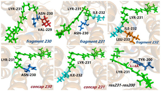 There are two kinds of fragment interactions in Equation (4), which includes one-body (1B) and two-body (2B) QM interaction terms. The one-body (1B) term represents the fragment with sequentially connected two residues or three residues, whereas the two-body (2B) QM interaction term represents the interaction between two non-neighboring residues that are spatially in close contact within a distance threshold. In this study, for PRs, the 1B term includes the chromophore LYR231 and its neighboring residues, namely, Fragment(230), Fragment(231), Fragment(232), Concap(230), and Concap(231), where Fragment(230), Fragment(231), and Fragment(232) contain residues 229–231, 230–232, and 231–233, respectively, and Concap(230) and Concap(231) contain residues 230–231 and 231–232, respectively (see Figure 1 and Figure S1 of the Supplementary Materials). The 2B term in this study represents the QM interaction between LYR231 and non-neighboring residue that is within 4 Å of LYR231. Therefore, Equation (4) becomes:
