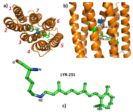 In this work, the structure of Blue-absorbing PR (BPR—PR105Q) was prepared by means of a hybrid Quantum Mechanics/Molecular Mechanics (QM/MM) approach and MD simulation [25]. The initial structure was taken from the X-ray crystal structure of BPR (PR105Q) in the dark state (PDB id: 4JQ6, chain B), which we chose as the template of PR105Q (PR with GLN105). The MODELLER [26] software, was utilized for homology modelling of PR105Q. The alignment of PR105Q and chain B of 4JQ6 was performed using TM-align [27]. Residue LYS231 and retinal were combined in a protonated retinal Schiff base (RSBH+) linkage as a non-standard residue in the Amber package [28,29], which we named LYR231 in this work. The structure of BPR (PR105Q) and LYR231 are shown in Figure 2. The distances between the chromophore and all residues are given in Supplementary Figure S2 of the Supplementary Materials.