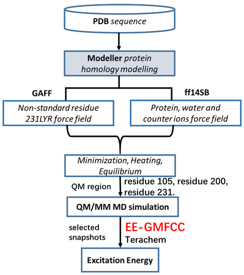 Figure 3 shows the work flow of the complete computational protocol utilized in this study for model construction, MD simulation, and excitation energy calculations. We used Ambertools to complete mutation operation for PR. First, we removed sidechain atoms of residue 105, while the backbone atoms (C, N, CA, O) of residue 105 and other parts of the protein were reserved. Second, we changed the residue name of R105 to the name of the residue to be mutated. Third, the sidechain atoms of the new residue were added to the backbone of R105 by the Amber program. Finally, the added residue was energy minimized to avoid unreasonable repulsive interactions with nearby residues. The minimization process was undertaken using Amber18 [28].