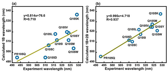 The correlation between the experimental absorption wavelengths of different mutations of PR105Q and calculated results using EE-GMFCC. The 1B and 1B + 2B results are both provided. (a) 1B: only the one-body QM interactions are included. (b) 1B + 2B: both the one-body and two-body QM interactions are included (see Equation (4)). 1B and 2B represent the excitation energy contributions from the covalently-linked three neighboring residues, and the two non-covalently-linked residues that are spatially in close contact, respectively.