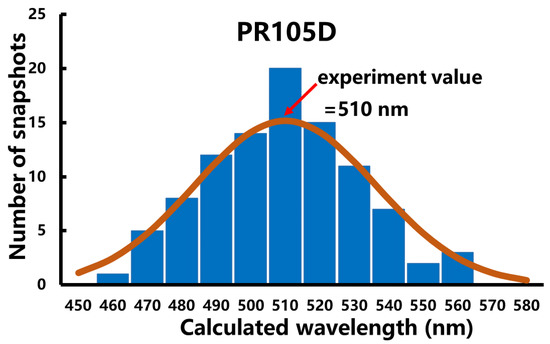Distribution of calculated absorption wavelengths for one hundred conformations of PR105D extracted from the last ps of QM/MM MD trajectory. The average value of calculated results is 512 nm, which is in excellent agreement with the experimental value of 510 nm.
