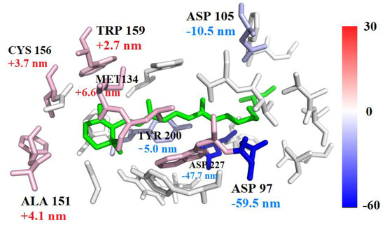 The per-residue decomposition of the average excitation energy of the PR105D protein is shown in Table 2 and Figure 6. Residues spatially close to chromophore had the greatest influence on the excitation energy of the protein. ASP97, ASP105, and ASP227 yield the largest blue shifts, whereas MET134, PHE152, and LEU135 show red shifts of PR105D. As shown in Figure 6, the most blue-shifted residue is ASP97, yielding a wavelength shift of −59.5 nm (+267.9 meV), compared to the chromophore alone, whereas the most red-shifted residue is MET134, with a wavelength shift of +6.6 nm (−26.3 meV).