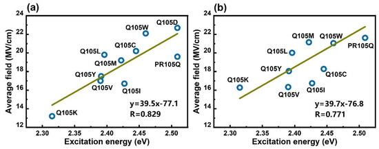 Correlation between the average electric field of 100 snapshots taken from QM/MM MD simulation trajectory for PR105Q and nine mutants, and the calculated 1B QM excitation energy by EE-GMFCC. (a) The average electric field calculated by the Amber ff14SB charge model. (b) The average electric field calculated by the PPC charge model.