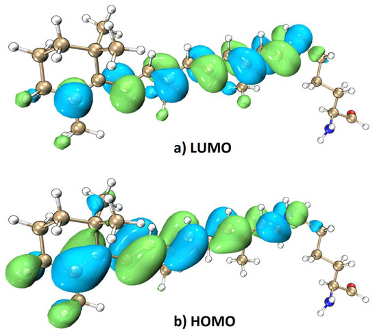 Representative snapshot of PR105D from QM/MM MD simulation and calculated LUMO (a) and HOMO (b) orbitals at the TD-B3LYP/6-31G* level where LYR231 was subjected to quantum mechanical treatment with background charges of the remaining part of PR105D. Charge transfer process of electron excitation from HOMO to LUMO [55,56].