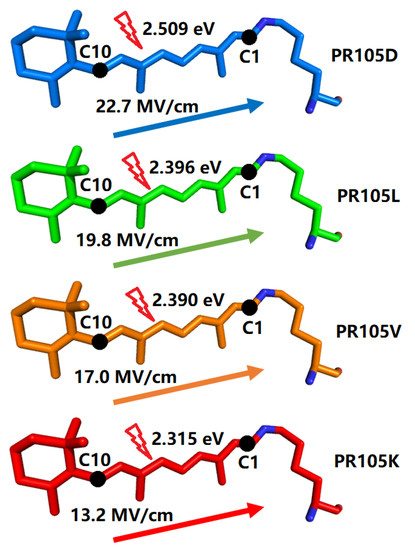 Figure 8 shows that the HOMO magnitude decreases from C10 to C1, whereas the LUMO magnitude decreases in the reverse direction to that of the HOMO. From natural transition orbital (NTO) analysis, the HOMO and LUMO are the dominant orbitals involved in this excitation. The electron excitation from the HOMO to LUMO of the chromophore thus has considerable charge-transfer character. Based on the direction of charge transfer along the polyene chain, we expect that increasing the environmental electric field along the conjugate chain from C10 to C1 will result in a blue shift of the electronic excitation [43]. Conversely, decreasing the magnitude of the electric field will cause a red shift of the electronic excitation. This expectation is borne out in our results: Figure 7 shows that the largest electric field between C10 and C1, with a value of 22.7 MV/cm (with the Amber force field), is observed for PR105D with a corresponding 1B excitation energy of 2.509 eV, which is larger than PR105L with 19.8 MV/cm. Similarly, the smallest electric field of 13.2 MV/cm is observed for PR105K, which has the smallest 1B excitation energy of 2.315 eV. A higher strength of the electric field corresponds to a higher excitation energy, which yields a blue shift (see Figure 9).