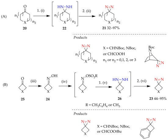 Diaziridine-mediated functionalized spirocyclic 3H-diazirine synthesis. (A) Five- to seven-membered heterocycle or bicycle ketone 20 as starting material. (B) Four-membered heterocycle ketone 25 as starting material. Reagents: (i) NH3-MeOH then NH2OSO3H, (ii) I2-Et3N, (iii) NH2OH·HCl and MeOH, (iv) Mesyl chloride or tosyl chloride and Et3N, (v) NH3, (vi) I2 and NaHCO3.