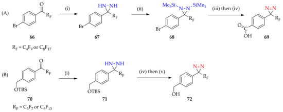 A new fluorous 3H-diazirine-based photoaffinity labeling probe taking advantage of fluorous chromatography and fluorous solid phase extraction was developed. These techniques aim to retard fluorinated compounds on fluorinated silica gel, while all other organic material is washed off the column with the appropriate organic mobile phase. A new fluorous 3H-diaziridine-based photoaffinity labeling probe, with a longer perfluoroalkyl residue substituted for the trifluoromethyl group in the non-radioactive photoaffinity labeling probe, can be synthesized starting from the transformation of perfluoroalkylated ketone 66 (perfluorobutyl and perfluorooctyl (Figure 9A) [72]) into diaziridine 67 through the conventional approach of oxime formation, tosylation, and treatment with liquid ammonia. The temporary silylation of the diaziridine moiety of compound 68 was performed by means of trimethylsilyl triflate, bromide–lithium exchange, and carboxylation with carbon dioxide for the conversion of benzoic acid. The final product was observed after the oxidation of diaziridine 68 into diazirine 69 with I2−Et3N. Prior to the study reporting the perfluoroalkylated 3H-diaziridine-based photoaffinity labeling probe, the perfluoropropyl and perfluorohexyl [73] residues had also been studied using the conventional approach, starting from the modification of perfluoroalkylated ketone 70 to result in diaziridine 71, which can readily be oxidized to 3H-diazirine 72 (Figure 9B).