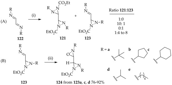 N,N-disubstituted diaziridines containing trifluoromethyl at the 3-position 117 can be synthesized using conventional conditions. Various trifluoromethyl imines 118 have been used in amination reactions with NsONHCO2Et as the aminating agent [88]. A twofold excess of NsONHCO2Et in CH2C12 without any addition of base at room temperature can give the corresponding N,N-disubstituted diaziridines 117 (Scheme 8A). N,N-Disubstituted diaziridines 119 were also successfully synthesized by the reaction of trifluoromethyl imines 120 with NsONHCO2t-Bu, a carbamate, which is known to give amination reactions only by an ionic pathway involving the corresponding aza-anion (Scheme 8B). The advantage of using conventional methods for the synthesis of N,N-disubstituted diaziridines was also observed when synthesizing bidiaziridine 121 from α-diimines 122 [89]. A two-phase H2O/CH2Cl2 system and the portion-wise addition of both amination agent and base (NsONHCO2Et and CaO) is considered to favor the formation of the monodiaziridine (E)-3-(iminomethyl)diaziridine-1-carboxylates 123, rather than its bidiaziridine 121 (Figure 16A). Further functionalization of this monodiaziridine, 123a,c,d, can be performed to obtain a hybrid compound containing an diaziridine and oxaziridine ring in one molecule of 3-(diaziridin-3-yl)oxaziridines 124 (Figure 16B) [89].