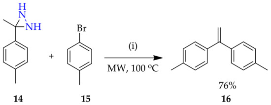 The reactivity of non-substituted diaziridines towards oxidants for the feasible synthesis of 3H-diazirines expands its applicability as an important intermediate. In a study exploring the process of Pd(0)-catalyzed cross-coupling of diazirines with aryl halides assisted by microwave irradiation [33], 3-methyl-3-(p-tolyl)diaziridine 14 was employed for the Pd(0)-catalyzed cross-coupling with 4-bromotoluene 15—resulting in the product 4,4’-(ethene-1,1-diyl)bis(methylbenzene) 16—under oxidative conditions following the addition of Ag2O as an oxidant (Scheme 1). The Pd(0)-catalyzed cross-coupling is the first example of a transition-metal-catalyzed reaction of diazirines supported by combination with the conventional oxidation of diaziridine, and significantly expands the chemistry of three-membered heterocycles.