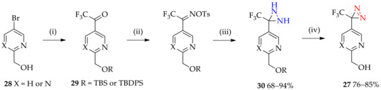 Syntheses of 3-pyridyl- and 3-pyrimidyl-substituted 3-trifluoromethyl-3H-diazirines 27. Conditions: (i) 1. TBS-Cl or TBDPS-Cl, imidazole, DCM, RT, 16 h, 2. n-BuLi, ether, 3. methyltrifluoroacetate, ether, 4 h; (ii) 1. NH2OH.HCl, AcONa, ethanol, reflux, 16 h, 2. pyridine, DMAP, Ts2O, DCM, 0 °C to RT or DIEA, DMAP, TsCl, DCM, −50 °C to 0 °C; (iii) liquid NH3, ether, 16 h; (iv) 1. Ag2O, ether, 2–16 h, 2. TBAF, THF, RT, 2 h.