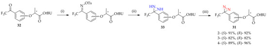 The novel asymmetric synthesis of trifluoromethyldiazirine-based lactisole derivatives 31 occurs as a result of the preparation of trifluoroacetyl modified on the aromatic ring of lactisole, which then introduces the diazirinyl three-membered ring on the trifluoroacetyl group [46]. However, to synthesize the starting material, advanced methods are required; since the 2-, 3-, and 4-trifluoroacetyl lactisole derivatives 32 (Scheme 3) need to consider the optical retention of the protected lactate counterpart, the conventional diazirine 31 construction via diaziridine 33 formation can be easily conducted, starting with oximation with hydroxylamine hydrochloride, tosylation for the hydroxyl group of oxime, diaziridine formation with liquid ammonia, and a final step of oxidation with activated MnO2 to obtain diazirine. The chiral center configuration was checked for every step, and asymmetric 2-, 3-, and 4- trifluoromethyldiazirine-based lactisole 31 were able to be synthesized with fine yields.