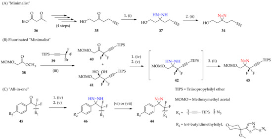 The term “minimalist” aliphatic diazirine-based probe for photoaffinity labeling was popularized by Yao’s group in 2013 [47], and while it was describes as “minimalist” diazirine linkers in a recent review [48]. The first generation [47] of so-called “minimalist” diazirine-based linkers was able to minimize the interference towards target binding and was built upon an alkyl diazirine and a terminal alkyne connected by short aliphatic chains [47,49,50]. These “minimalist” linkers 34 were made possible by synthesized representative aliphatic ketone containing alkyne 35, which had previously been transformed from ethyl acetoacetate 36 as the starting material (Scheme 4A). The minimum length was limited to 2 carbons on both sides of the diazirine moiety in the linker in order to enable the linker to possess different functional groups and to prevent any side reaction during the requisite NH3/NH2SO3H step in diaziridine 37 formation. Subsequently, the first-generation “minimalist” diazirine linker’s 34 alkyne terminal was changed into cyclopropenes, which are similar in size, by rhodium-catalyzed reaction of α-diazo esters with alkynes, which have since been claimed to be the second generation of minimalist linkers [51,52].