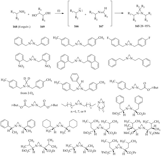 - Beebe, A.W.; Dohmeier, E.F.; Moura-Letts, G. Diastereoselective synthesis of substituted diaziridines from simple ketones and aldehydes. Chem. Commun. 2015, 51, 13511–13514. [Google Scholar] [CrossRef]